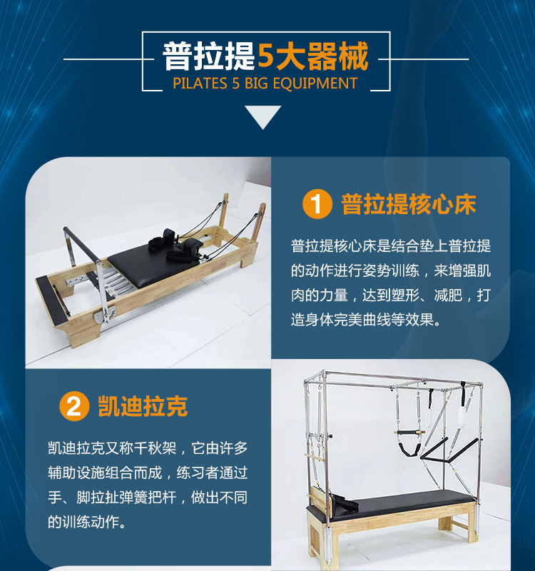 Cadillac(凯迪拉克)是进行普拉提训练的主要器械之一,通 过对身体核心部位拉伸锻炼使脊柱变的柔软有韧性,同时改善身 体线条,对矫正颈部和脊椎起到好的效果。